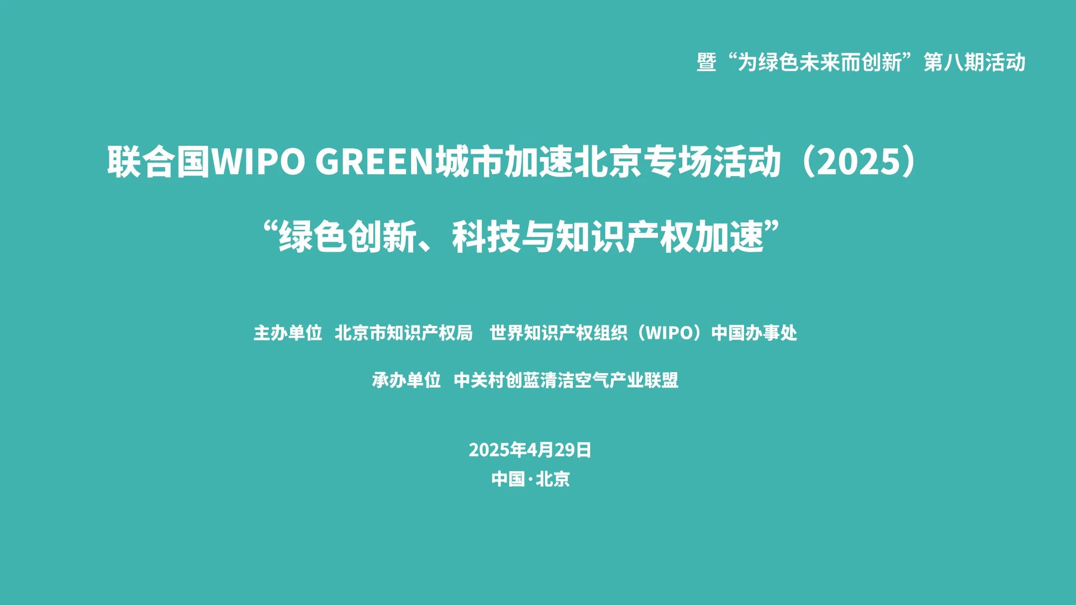 为了迎接2025年世界知识产权日的到来,北京市知识产权局与世界知识产权组织中国办事处主办,中关村创蓝清洁空气产业联盟承办,计划于2025年4月29日在北京举办主题为“绿色创新、科技与知识产权”的北京试点专场加速活动。活动将会分享 WIPO GREEN 城市加速项目北京试点的进展,组织IP战略培训,举办中国绿色科技中小企业知识产权战略辅导专项(IPMC)第一期结营典礼,并邀请绿色科技提供方与需求方开展技术展示与对接以及签约等活动。本次活动是“为绿色未来而创新”绿色科技知识产权活动的第八期活动,同时也是世界知识产权组织WIPO GREEN全球合作网络在中国开展的活动。