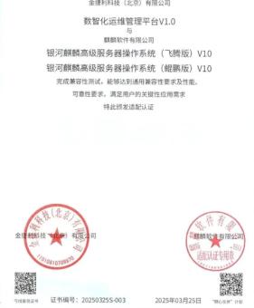 第三届创蓝碳中和先锋奖获奖企业之一金捷利数智化运维管理平台完成麒麟软件适配认证,携手共筑信创生态新未来在数字化转型与信息技术应用创新(信创)加速推进的背景下,金捷利自主研发的“数智化运维管理平台 V1.0”与麒麟软件有限公司的“银河麒麟高级服务器操作系统(飞腾版)V10”“银河麒......