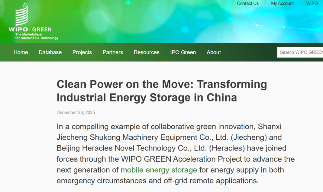 山西捷成数控机械设备有限公司(捷成数控)与北京海得利兹新技术有限公司(海得利兹)通过WIPO GREEN加速项目,共同推进下一代移动储能,应用于紧急情况和离网远程应用的能源供应。